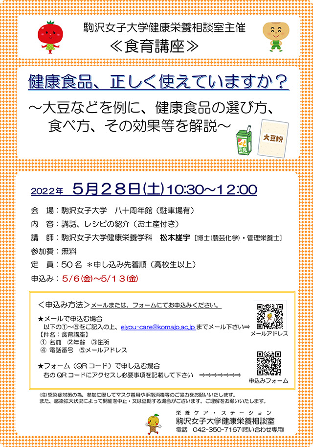 2022年5月28日(土)に食育講座「健康食品、正しく使えていますか?」を開催します。