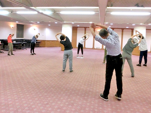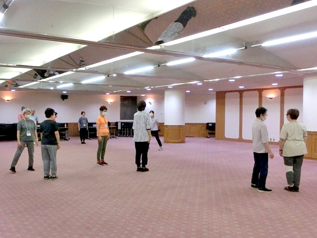 当大学健康栄養学科教授・小澤多賀子先生の指導のもと、ウォーキングや健康づくり運動についての講話、参加者同士で歩き方姿勢のチェック、歩行動作に重要なストレッチや筋力運動を行いました。また、講堂内を広く使ってウォーキングテストを行い、歩幅やスピードなど自分の歩き方を確認しました。