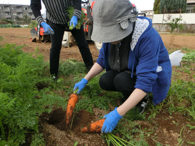 そのあとは、皆さんお待ちかねの野菜収穫体験。園主さんから稲城市の農業についてお話していただき、大根、白菜、里芋、人参、とたくさんの種類の野菜を自分たちで収穫させていただきました。