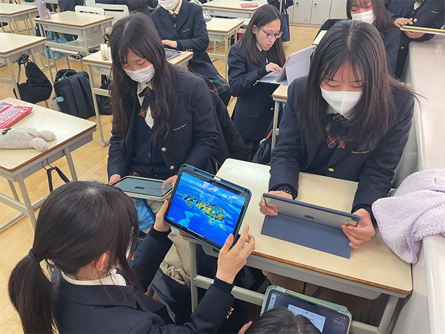中学2年生では、冬休みの宿題に世界の6州から1つ選びその地域について、歴史、地理、文化、観光や特産物などを調べてきました。同じ州の担当ごとに調べてきたことを発表し、それらを受けてさらなる問を立てて、それらに対し自分たちなりに答えや意見を見出していきます。適切な「問」を見つけることが難しく、AIに聞いてみている生徒もいました。これらの活動が、次年度のシンガポール修学旅行で必要な、国際的な見識や態度に繋がると信じております。