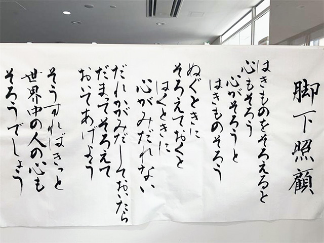 - 学校の下駄箱前にある「脚下照顧(自分の足元を見つめ直しなさい)」を思い出した。家ではできていても学校ではできていなかったので、これからは学校でも気をつけたい。はきものをそろえることは自分を振り返り、心を整えることにつながると思う。みんながそろえると、みんなの気持ちもすっきりする。