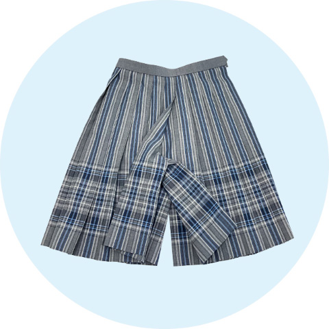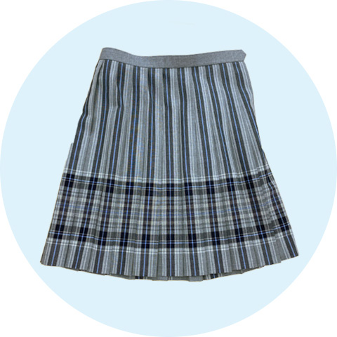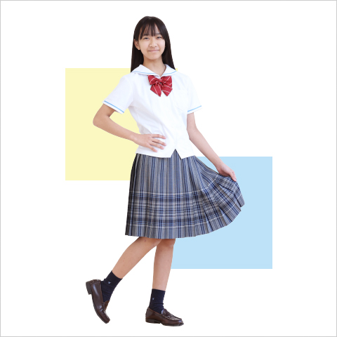 鮮やかなブルーグレーを基調としたチェックスカートに、空色のブラウスとサマーベストや、動きやすいポロシャツでさわやかにコーディネート。新しくセーラーブラウスも加わりました。
