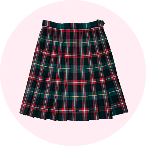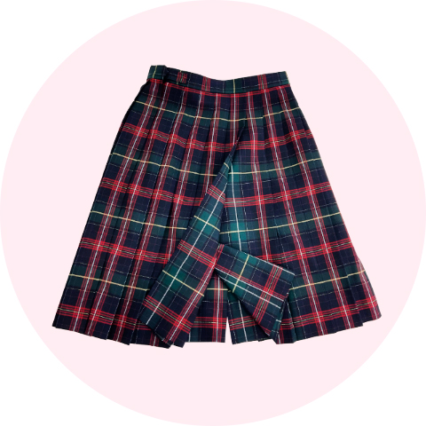 濃緑×白×赤ラインがアクセントのチェックスカートとお揃いのチェックリボンを結びます。金ボタンが上品なブレザーとあわせて落ち着いた雰囲気です。新しくスラックススタイルも加わりました。