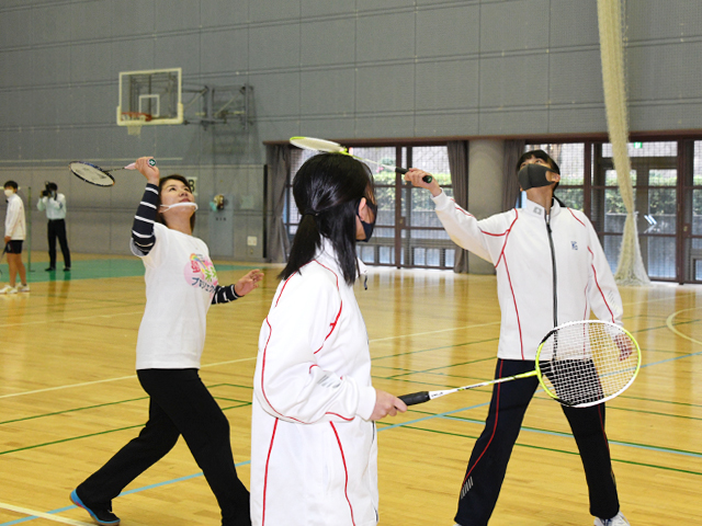 その後、生徒たちがコートに分かれラリーを行う中、藤井さんも中に入って、生徒たちへの指導を行っていただきました。「いいね!上手」と声かけに、生徒たちのテンションも上昇です。