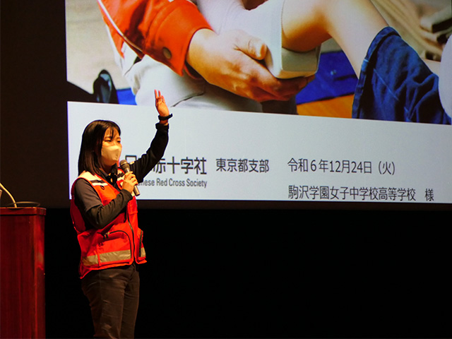 12月24日(火)の終業式後、日本赤十字社より講師の方をお招きして赤十字防災セミナーを行いました。セミナーでは、災害時に役立つ知識と技術を体験を通じて学ぶことができました。