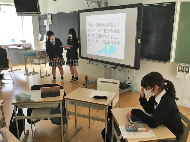 答えはありません。どんな話し合いが行われたのでしょうか。意見の割れた点やどのようにしてグループの意見をひとつにまとめたのか、お互いの意見をぶつけてまとめた過程が発表されました。これまであまり経験のない授業の進め方に、戸惑いながらも、和気あいあいとした雰囲気の中で授業は進んでいました。話し合いを通して授業のおかげで、クラスの友達とのつながりも広がったようです。