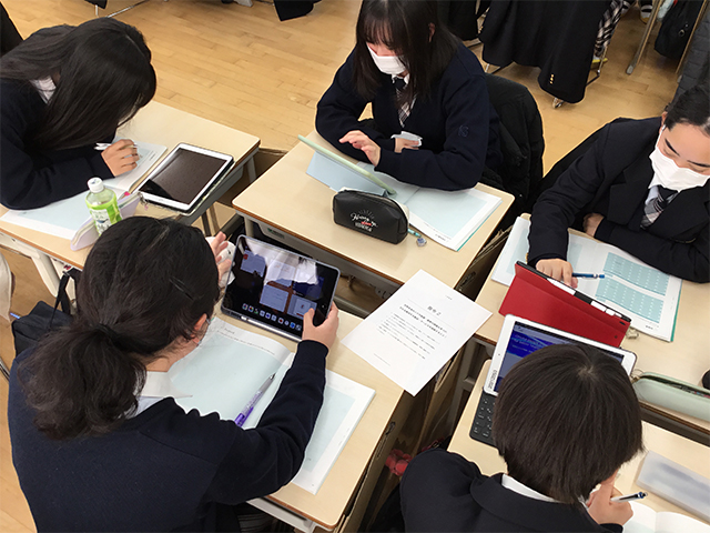 3学期の授業テーマは企業インターンです。前回の授業で、生徒もよく耳にする企業6社からグループごとに1社を選び、1週間かけて調べてきました。
