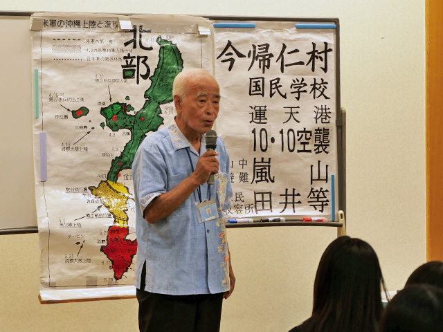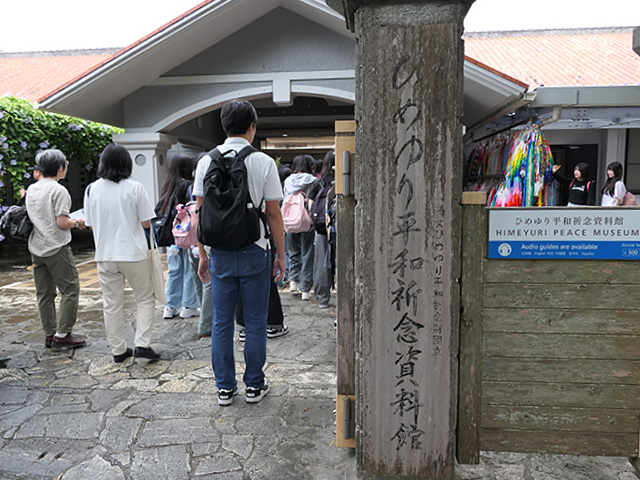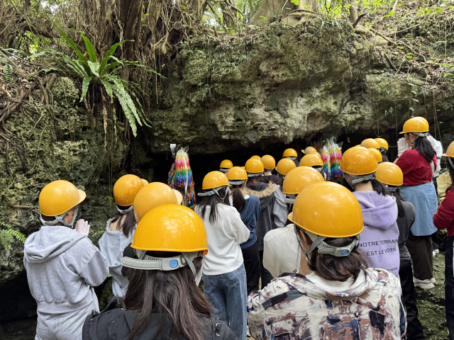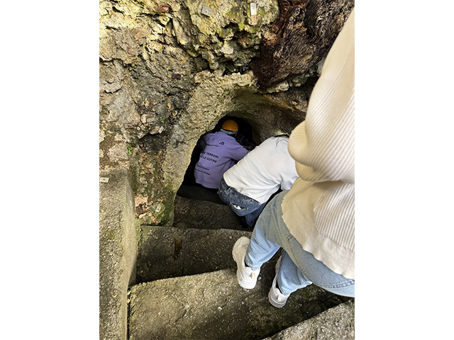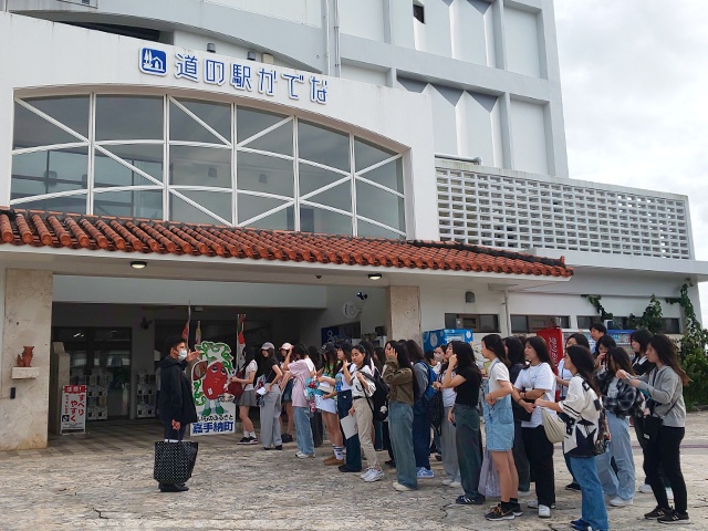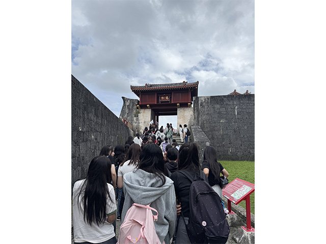 一日目は沖縄県平和祈念資料館を訪れ、宿泊先のホテルでは沖縄戦を体験された90歳の方のお話を聞きました。二日目は糸数壕とひめゆり平和祈念資料館を訪れました。糸数壕では全員、入壕体験ができました。午後には、まだ建設中の首里城を見学し、基地問題の学習のために「道の駅かでな」から嘉手納基地を見て、基地の跡地に建てられたアメリカンビレッジへ行きました。