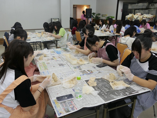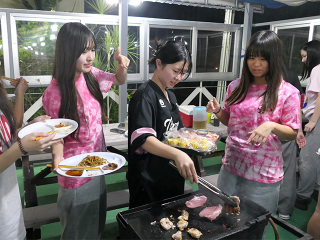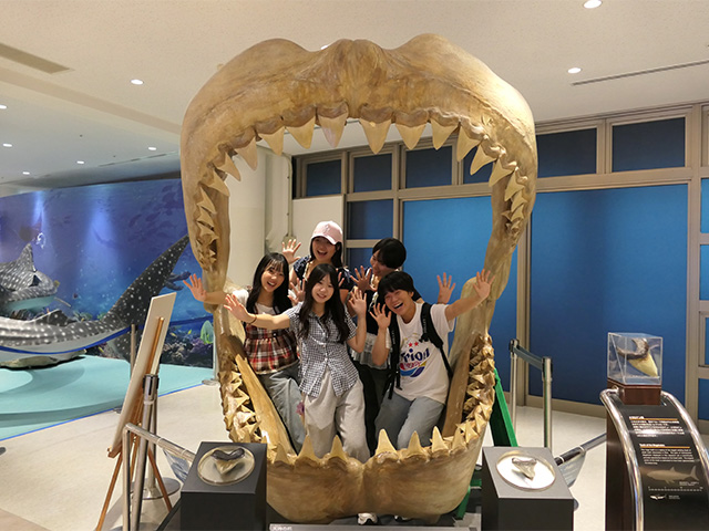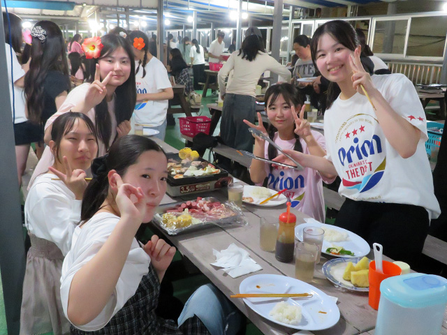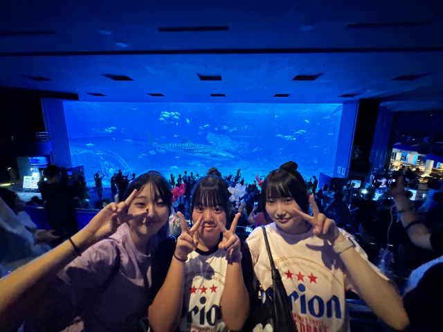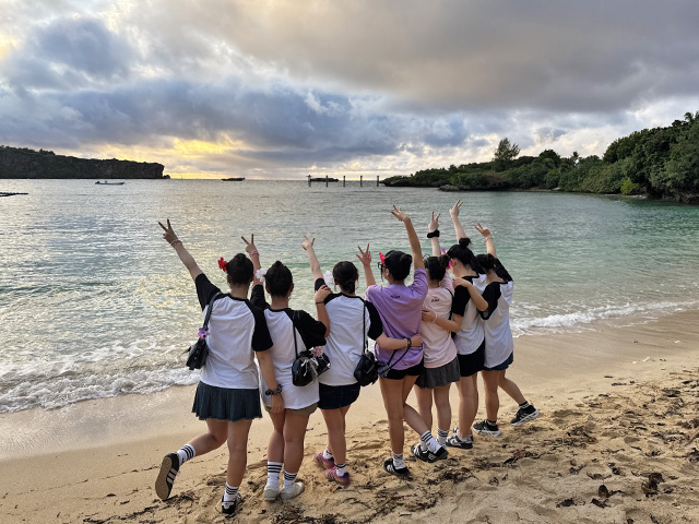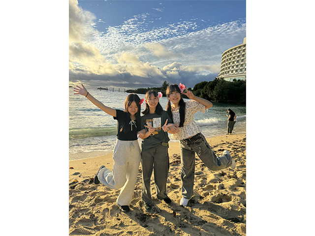 三日目は、午前中はマリン体験とシーサー作りに分かれる予定でしたが、荒天のため、マリン体験は中止となり、全員で漆喰シーサーを作りました。午後には沖縄美ら海水族館を訪れました。宿泊するホテルに着いた頃には雨がやんできたので、生徒たちは海辺を散策することができました。