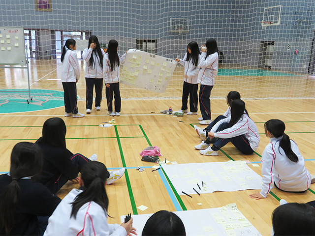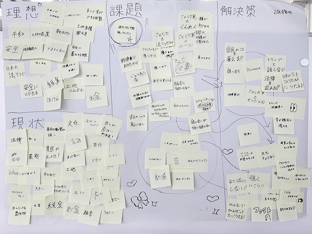 高校2年生は11月15日(土)に沖縄米軍基地問題についてグループで考え、発表をする活動を行いました。沖縄の基地問題について考える取り組みは修学旅行のテーマのひとつです。生徒たちは公民の授業を通して沖縄の米軍基地について、その成り立ちや問題について学びました。10月29日から11月1日に実施された沖縄修学旅行では、現地の方の案内で道の駅「かでな」から嘉手納基地を見て、その広さや戦闘機の騒音と振動に驚きました。基地の跡地に建設されたアメリカンビレッジでは、沖縄の人々のことを考えた地域開発について話を聞きました。その体験をもとに基地問題をどうしたらよいかという答えの出ない問いに2時間かけて取り組みました。グループごとに話し合って現状と理想をあげ、そこから課題、そしてその解決策を考え、模造紙を作って最後には発表をしました。