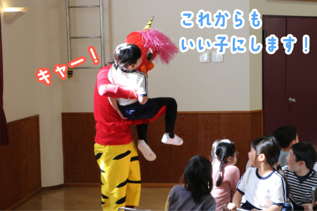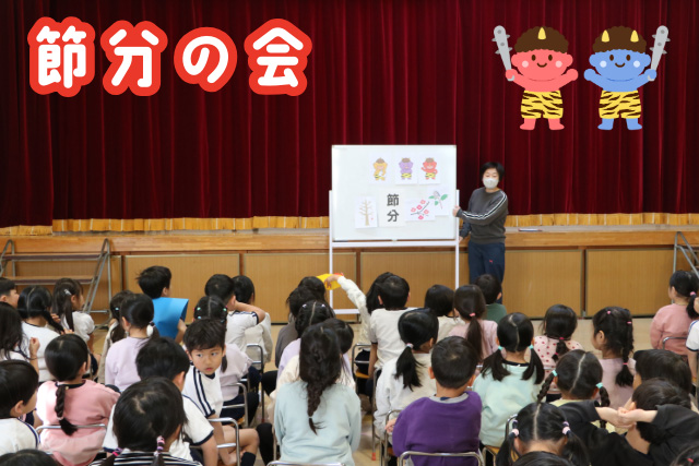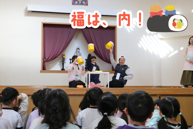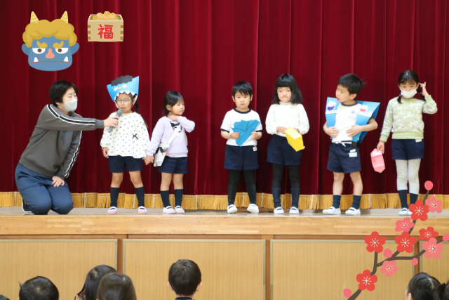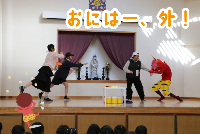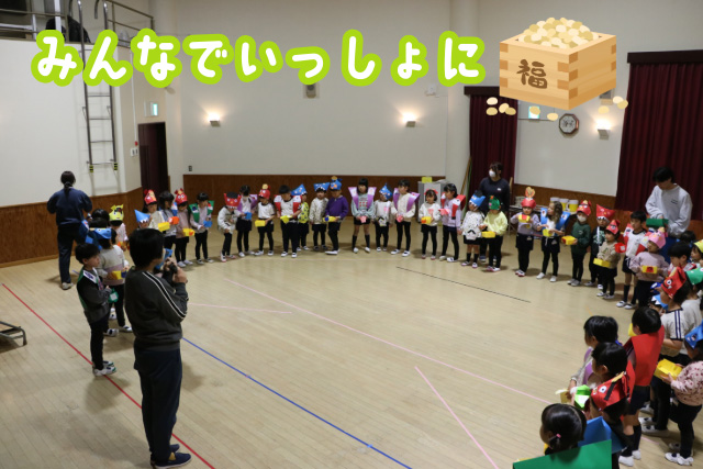 節分の会が終わった後には、縦割り保育のお友だちと一緒に豆まきをしました。
