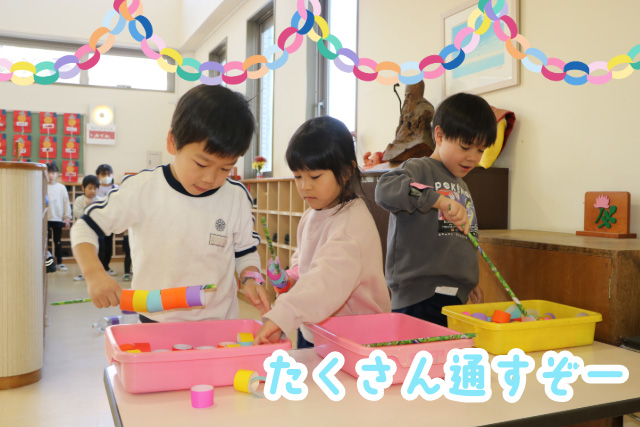 玄関では「輪っか通し!」お友だちと何個通せたか数えてみよう!