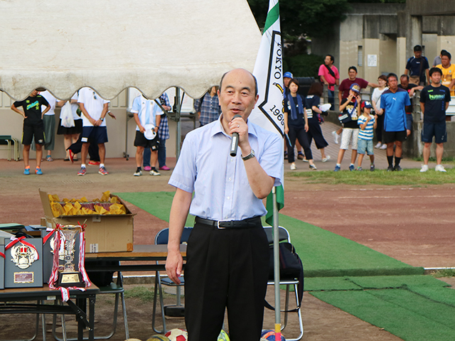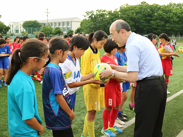 学園を代表して、閉会式に参加した駒沢学園女子中学・高等学校の橋本衆宝校長からは「駒沢学園女子中学・高等学校にもサッカー部があります。8月にはオープンキャンパスがあるので、学校の雰囲気をご覧になりたい方は、是非ご来校下さい」との挨拶があり、参加賞として各チームにサッカーボールと駒沢女子大学特製クリアファイルが手渡されました。