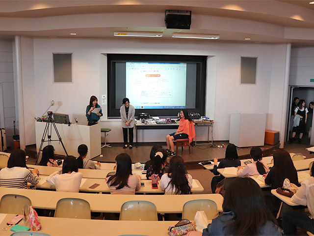 メイクアップのデモンストレーションでは保育科の千葉 玲奈さんがモデルとなってメイクをしていただき、笑顔が輝く魅力的なお化粧を間近で見ることができました。