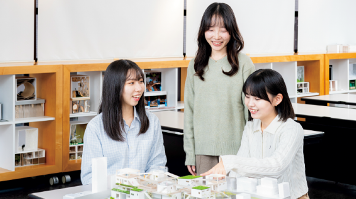 空間がわかる人、空間をつたえる人、空間をデザインする人、になる。をキャッチフレーズに掲げ、私たちのくらしのまわりに広がる建築とインテリアについて、生活する人の目線で学びます。身近な住居空間から学び始め、幅広い分野の知識と技術を楽しみながら身につけ、空間を理解し、表現し、創造する人をめざします。