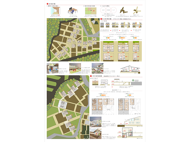 閉園から15年がたち、思い出の地から廃墟へと姿を変えた「多摩テック」の歴史的財産を生かすと同時に、農業への新たな関わり方と暮らし方を提案しています。「多摩テック」の遊園地としての要素を街のカラーや区画へと再構築し、緑地と高低差を生かしながら新たな農家住宅群として生まれ変わらせました。この場所で2農5X(週2日は農作業に携わり、5日は現在の仕事などの”X”で収入を確保する)というライフスタイルを通じて農業をしながら一般社会と仕事を通してつながりを持ち続けることが可能であり、農業や社会、そして隣人と付かず離れずの関係を保ちながら穏やかな生活ができるよう計画しました。