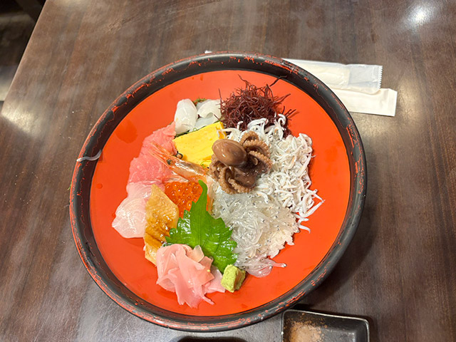 集合場所の片瀬江ノ島駅から江の島まで徒歩で向かい、まずは腹ごしらえ! 江の島名物の生しらすがたくさん乗った「海鮮丼」をいただきました。新鮮なマグロや鯛、甘エビなど、とっても豪華でおいしかったです。