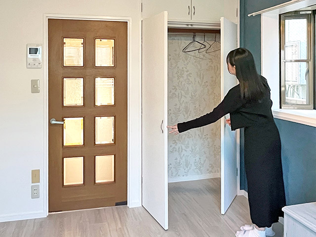 収納内にも居室と同じ上品な花柄クロスを用いました。派手すぎないため洋服の印象を変える恐れを防ぎつつ、洋服をしまうのが楽しくなるよう細部まで高級感を追求しました。また、ブルーのアクセントクロスを引き立てる木製の飾り棚も空間のアクセントになっています。