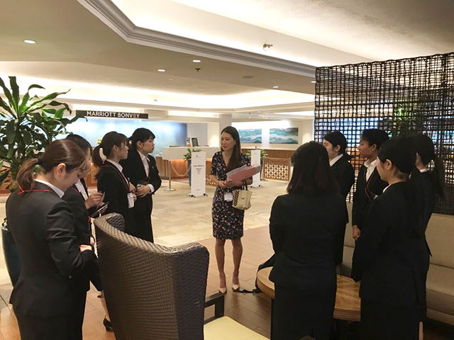 参加学生は、事前に「旅行業実務論」、「宿泊業・飲食業実務論」、「ホスピタリティ概論」を履修し、「海外インターンシップ実習」を履修登録します。その後、面接による選考を経て、JAL客室乗務員の経験をお持ちの講師によるマナーセミナーで社会人としての基本を身につけました。それとともに英語プレゼンテーションのワークショップとハワイ観光資源についてレクチャーを受けました。さらにハワイ出発前に、品川の東京マリオットホテルを見学し、JTBで事前研修を行いました。