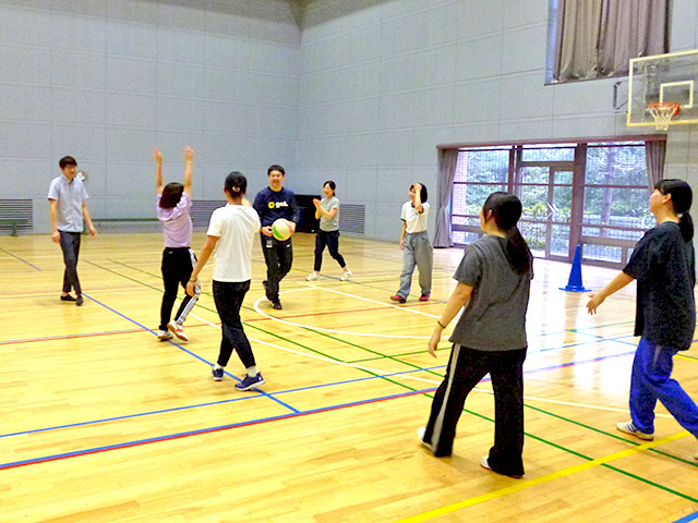 運動チームは、運動不足解消・交流・思い出作りを目的として、10月4日(金)に本学の大学・短大体育館で、今年度2回目となる「運動会」を開催しました。今回の参加者は学生と教員合わせて15名と少なめでしたが、「ドッジボール」「バレーボール」「バスケットボール」の3種目を実施し、スポーツを大いに楽しんだ会となりました。