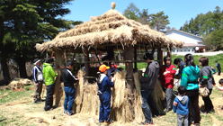 会場となった小諸エコビレッジは、自然と共生し環境に配慮した持続可能なくらしの実現を目差し、都市と農村の交流拠点としてライフスタイルの実践と学びの場を提供する事を目的に、前出の渡邉さんが運営しています。わらの家も極力地域の自然素材を使い人の手による原初的な方法で作るため、私も自分が縄文人だったらどう作るか,とイメージしながら作業を進めました。駒女チームは学生5人で参加し、主に子供たちでは難しい屋根のわら葺き作業を担当しました。彼女たちにとっては初めての作業とはいえ、授業でいろいろものづくりを経験しているのですぐに慣れて順調に葺き終えることができました。また、廃材を使って小屋のベンチや、オーガニックコットンのカバーに干しわらを詰めたクッションなどをつくりました。