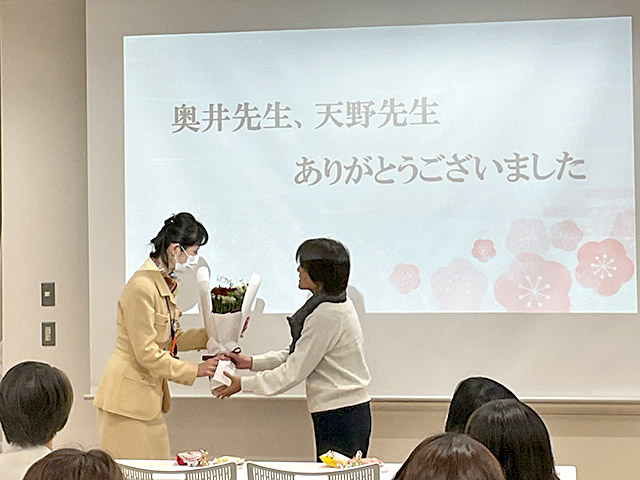 ご発表後、短時間ではありましたが、茶話会&花束贈呈セレモニーを行いました。